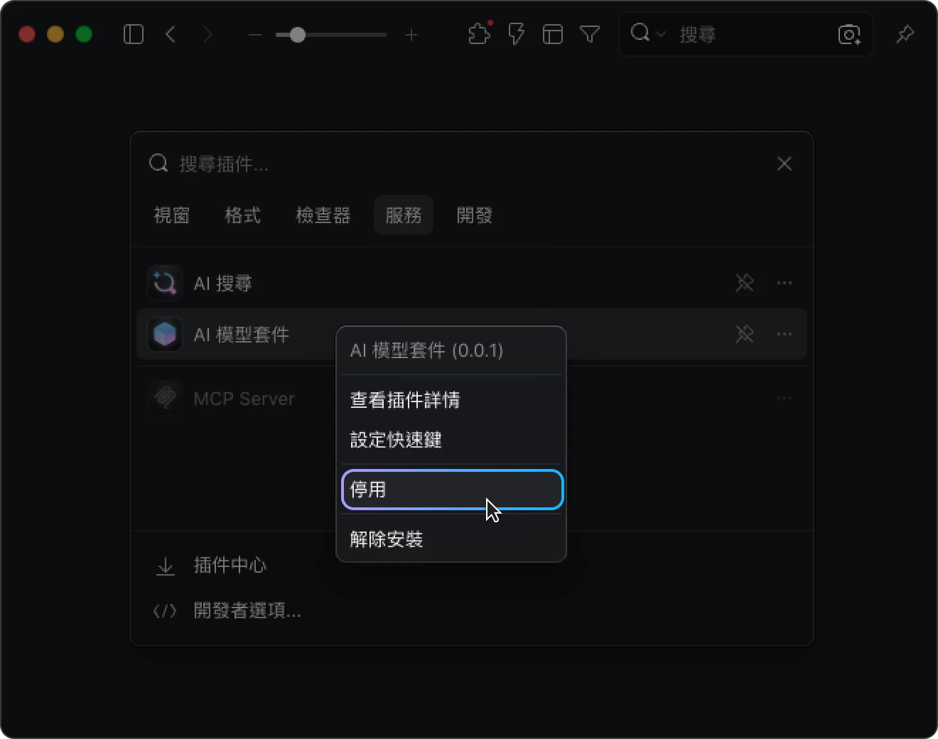 - 偏好設定:服務型插件(如 AI 搜尋、AI 模型套件、MCP Server)也提供獨立開關;停用後會顯示啟用提示,可隨時一鍵恢復。