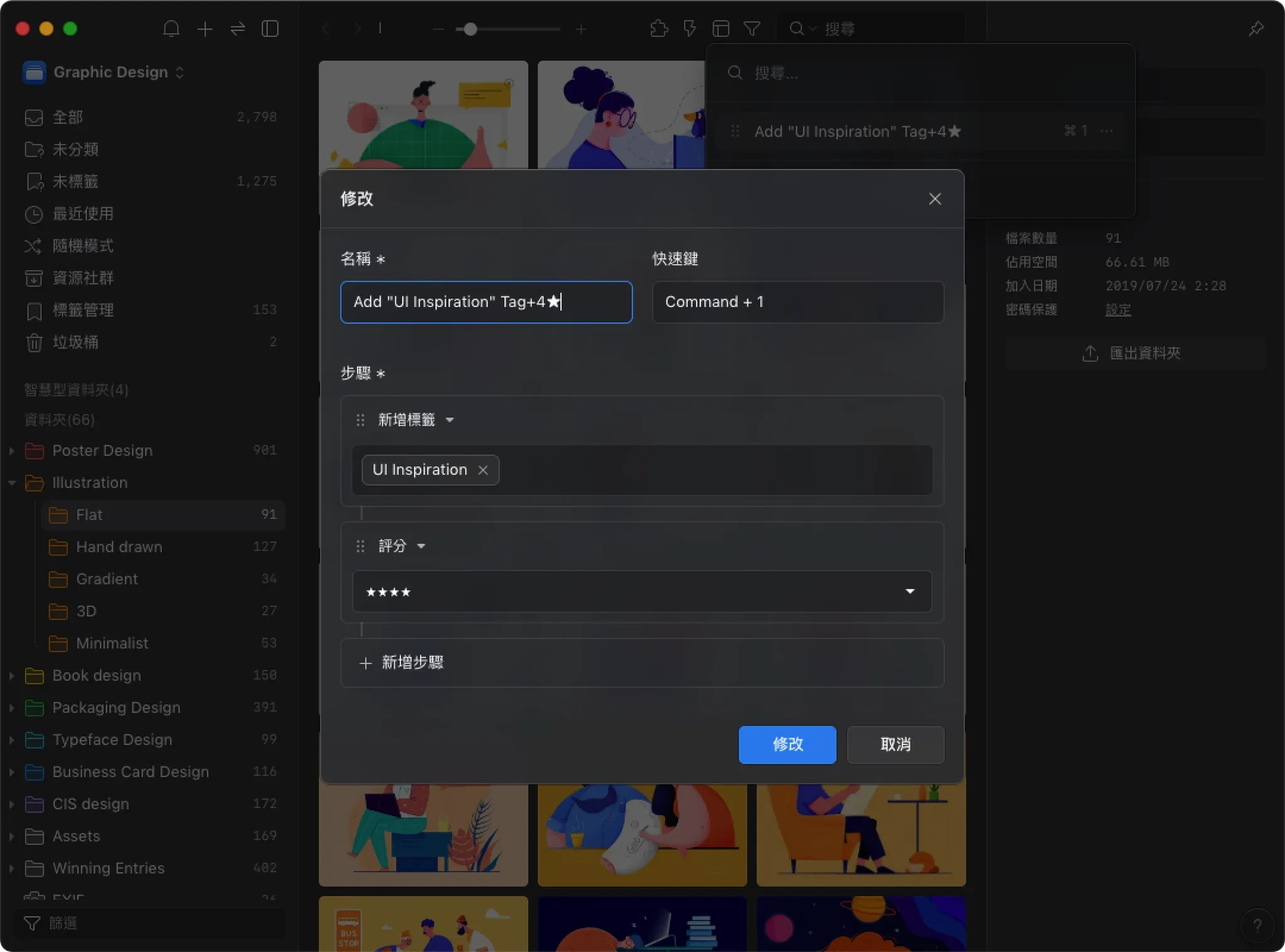 使用 Eagle 的「動作」功能,把「加入 UI 靈感資料夾+貼上 UI Inspiration 標籤+評分 4★」整合起來存成一個動作,再綁定一個快捷鍵,匯圖後全選,按下快捷鍵就搞定分類、標籤、評分,一秒完成平常得花 10 分鐘的事,根本像開了神操作外掛。